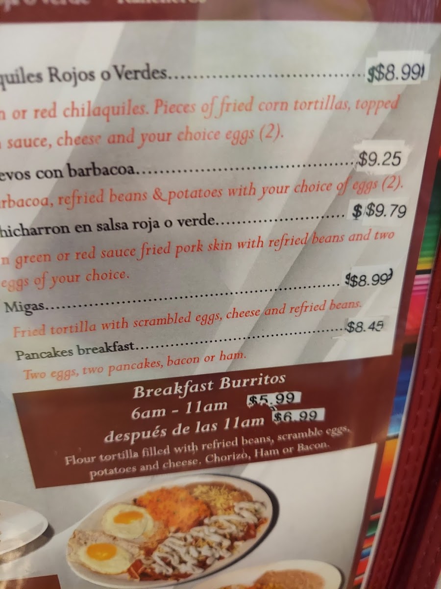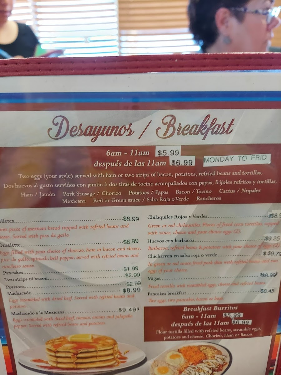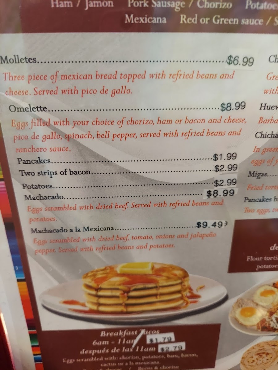 Two eggsserved with ham or two strips of bacon, potatoes, refried beans and tortillas. / Dos huevos al gusto servidos con jamon o dos tiras de tocino acompanados con papas, frijoles refritos y tortillas.